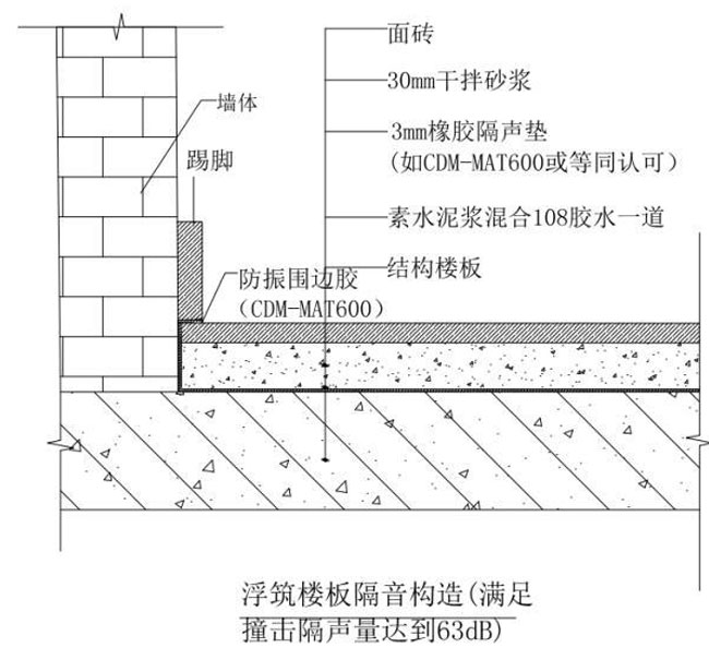 在四周墻邊將隔音墊邊緣向上折起,用建筑膠點粘樓板隔音墊于墻面,翻包高度為包括混凝土和面層的總厚度,折起翻包部分接縫也要用膠帶粘貼嚴密。